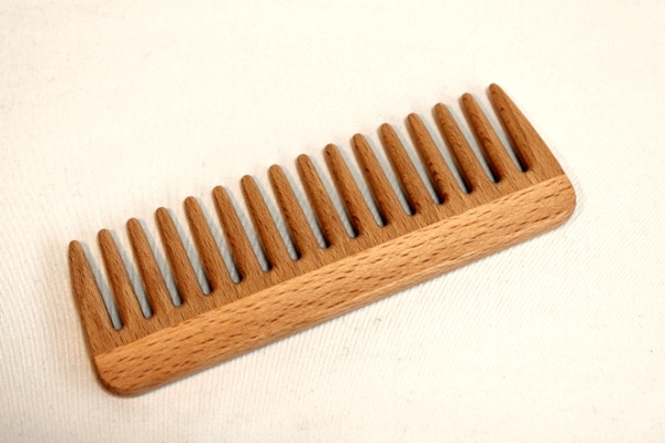 Buchenholzkamm mit breiten Zinken zum sehr leichten Durchkämmen insbesondere von dichten Haaren. Wie alle unsere Holzkämme sehr fein bearbeitet und abgerundet.