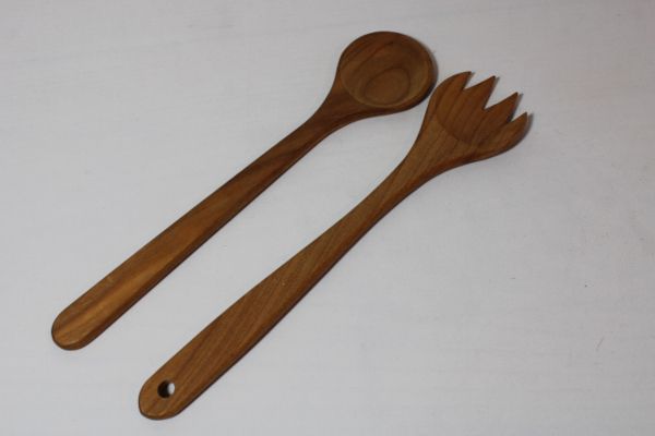 Salatbesteck mit rundem Löffel und runder Gabel in kleiner Ausführung mit flachen Griffen.